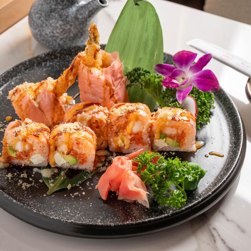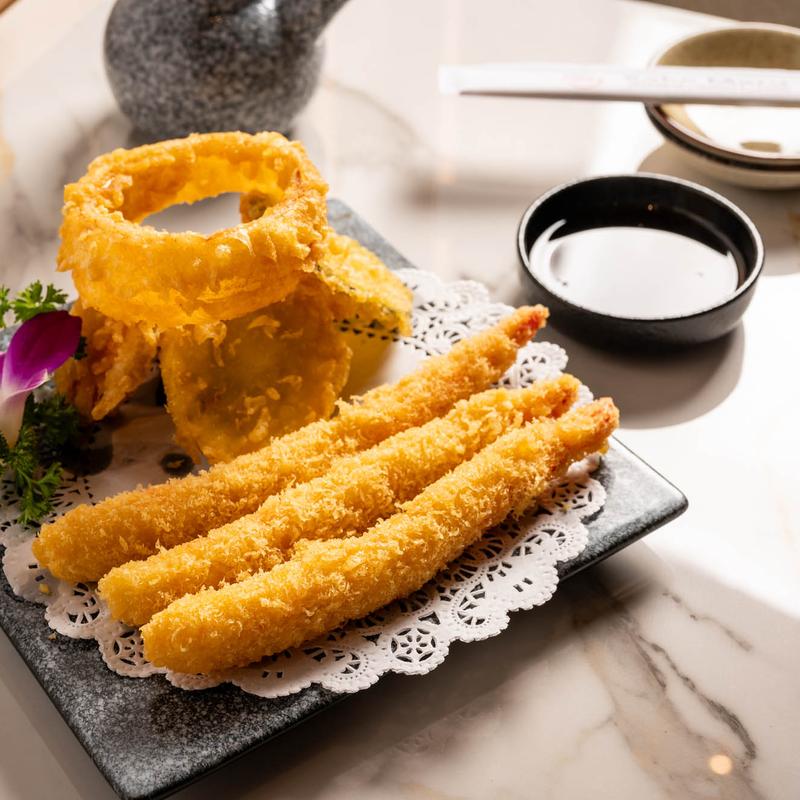 Shrimp tempura, sushi and sashimi, steam shumai & California roll