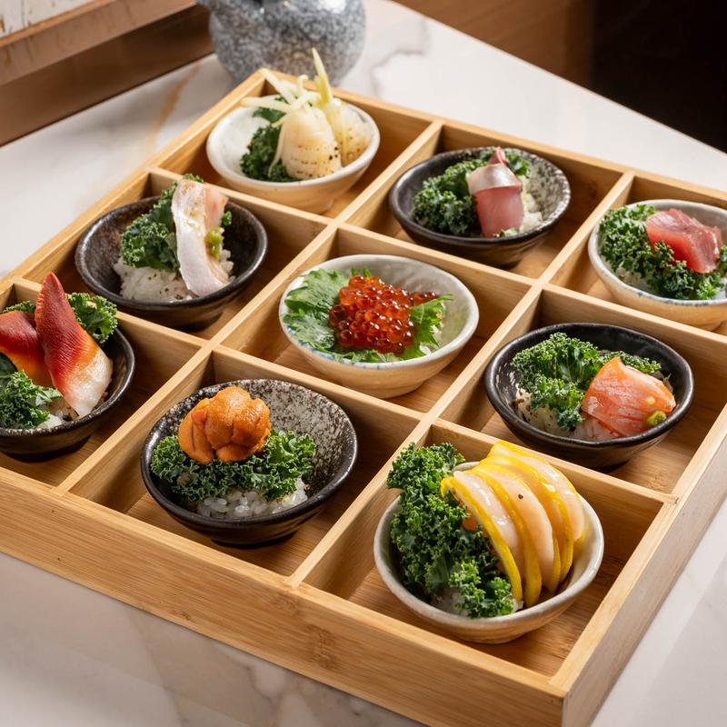 Sushi rice topped with 15pcs assorted sliced fresh fish